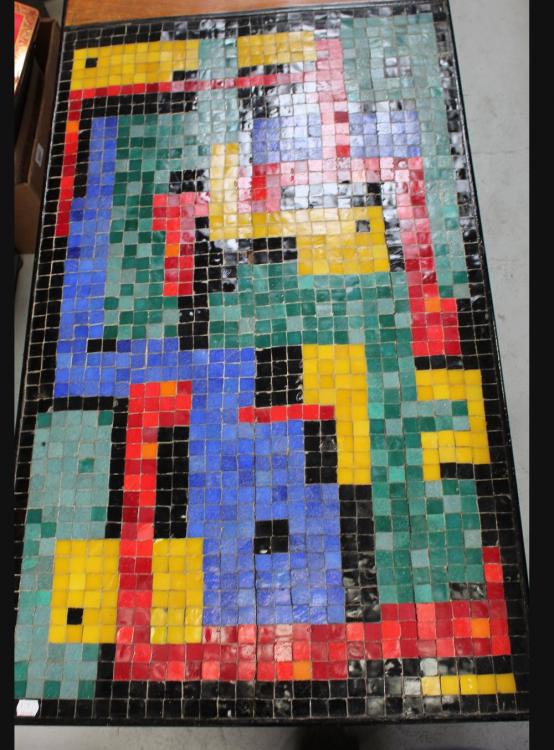 Lot 80 of 681: A c1960s retro coffee table, multi-coloured abstract mosaic tile top to tapering tubular supports, 154 x 63cm and a contemporary stained pine bookcase, two shelves over three separate compartments, 80 x 187cm (2).