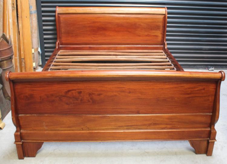 Lot 83 of 681: A contemporary mahogany bedroom suite comprising a three door wardrobe, one compartment with shelving for shirts above six drawers, on a stepped plinth base, two matching bedside cabinets and a matching king size sleigh bed, width 166cm (4).