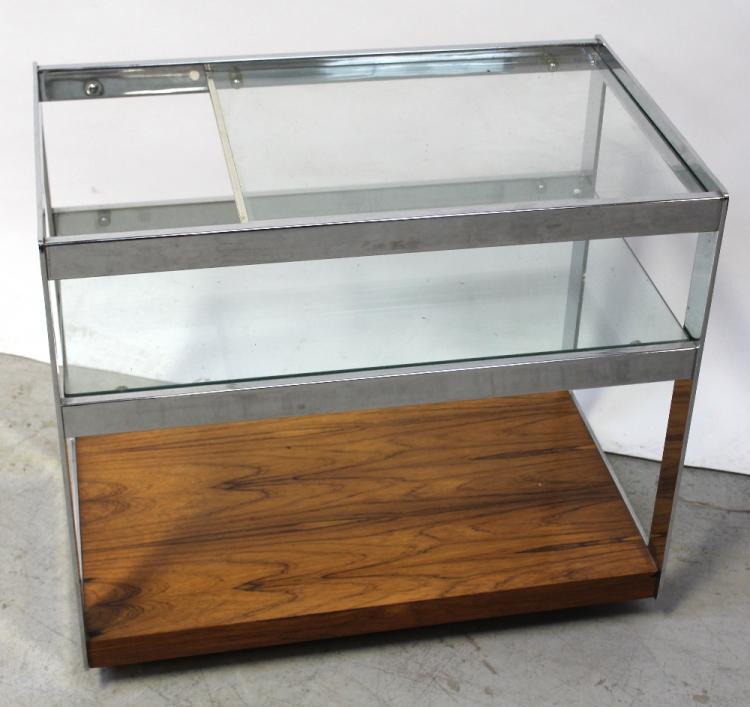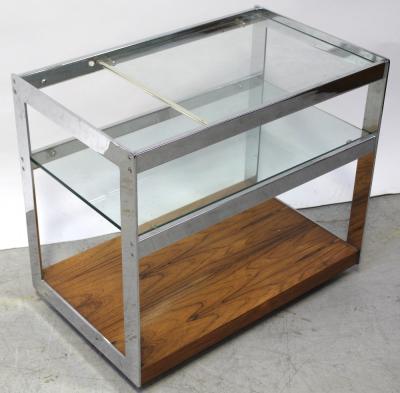 Lot 85 of 681: Merrow Associates; a 20th century Richard Young rosewood and chrome cocktail drinks trolley, glass top and centre glass shelf to lower rosewood shelf, all within a chrome frame to concealed castors, 74 x 65cm. CITES certificate no.577466/03.