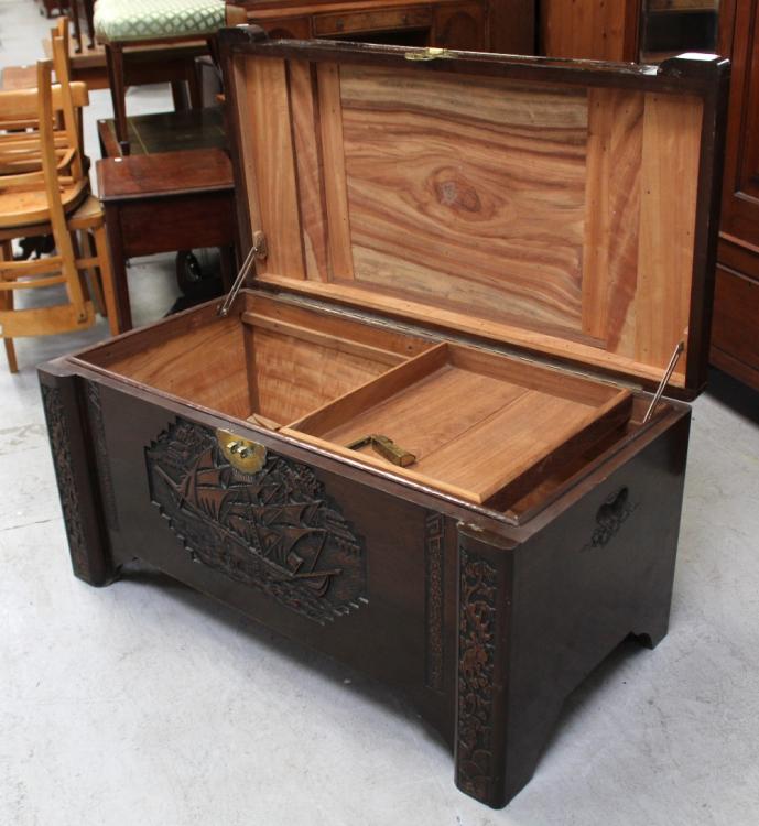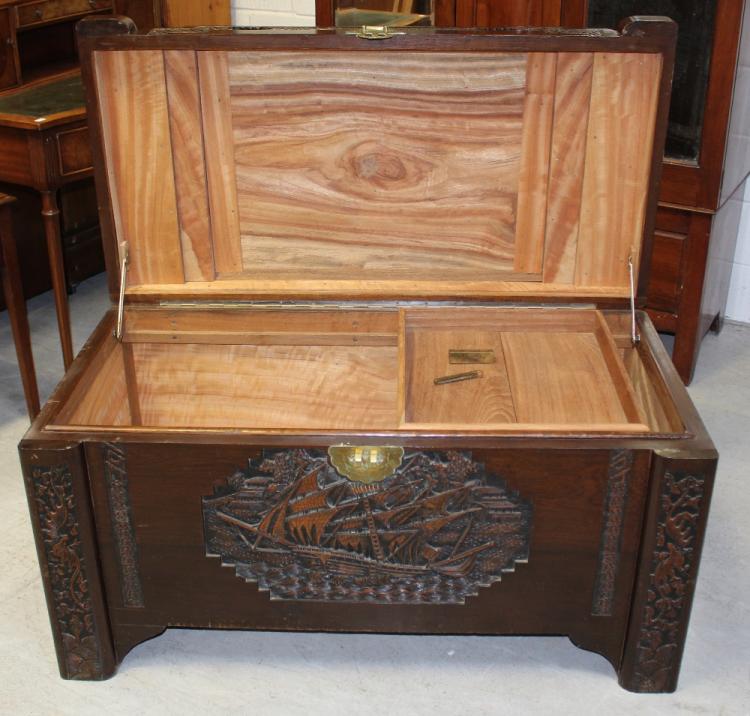 Lot 26 of 944: An early-to-mid 20th century Chinese camphorwood chest with relief ship carving within a floral and stylised keywork border, sliding tray compartment to the interior, approx width 110cm.