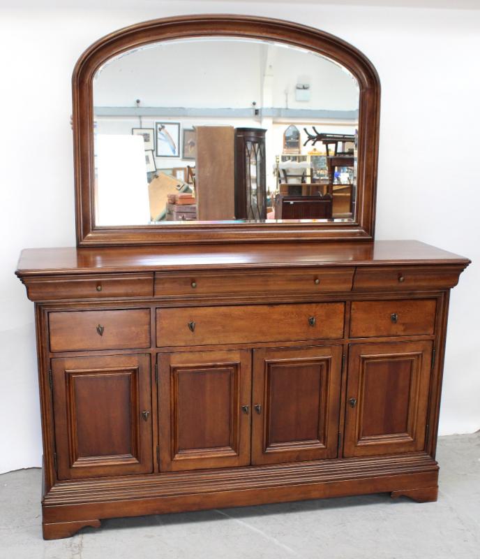 Lot 66 of 944: A 20th century mahogany dresser/sideboard, three frieze drawers over one long central drawer, with smaller drawer to either side over four panelled cupboard doors to plinth and bracket support, 106 x 160cm and an attached mahogany overmantel mirror, 88 x 124cm (non-matching).