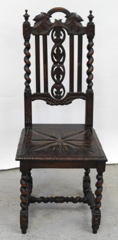 Lot 78 of 944: A Victorian Gothic oak hall chair with barleytwist supports to cross-stretcher and peg feet, height 107cm.