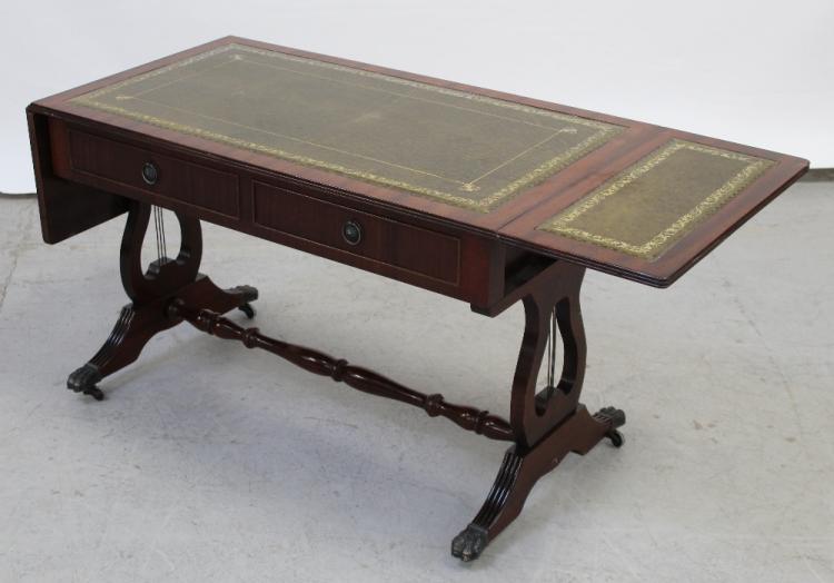 Lot 81 of 944: A modern reproduction mahogany sofa table with olive green gilt-heightened tooled leather top, supported on twin lyre-shape slab ends supported by cross-stretcher, width approx 95cm.