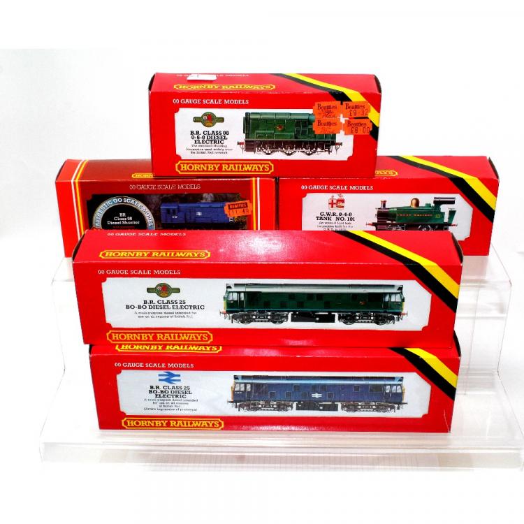 Lot 621 of 959: Five Hornby OO gauge scale model engines, B.R. Class 25 Bo-Bo diesel electric - Blue, B.R. Class 25 Bo-Bo diesel electric - Green, B.R. Class 08 0-6-0 diesel electric R.156 class 08 diesel shunter, G.W.R. 0-4-0 tank no.101 R.077, and BR Class 08 diesel shunter R.780 with automatic uncoupling device (5).
