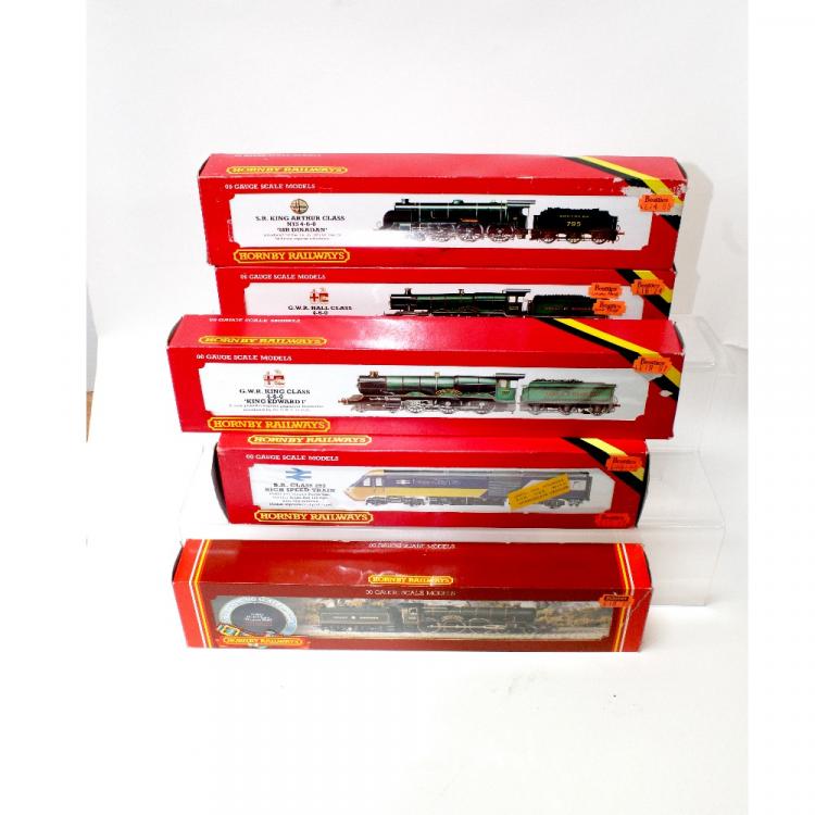 Lot 622 of 959: Five boxed Hornby OO gauge model engines, B.R. Class 253 high speed train, R.069 HST power/dummy power cars, G.W.R. King Class 4-6-0 'King Edward I', GWR Hall Class 'Hagley Hall' with crew and vacuum pipes, S.R. King Arthur Class N15 4-6-0 'Sir Dinadan', and G.W.R. Hall Class 4-6-0 'Kneller Hall' (5).
