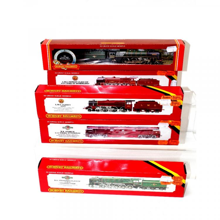 Lot 624 of 959: Five boxed Hornby OO gauge engines, BR Standard Class 9F 2-10-0, 'Evening Star', R.842 LMS Class 5 Loco, R.352 B.R. Class 52 Western diesel, R.033 BR Class 7MT Loco, 'Morning Star', and L.M.S. P Class 5XP 4-6-0 'Duke of Sutherland' engine (5).