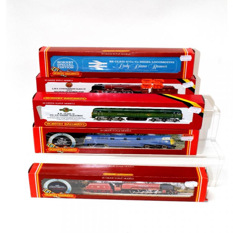 Lot 625 of 959: Five boxed Hornby OO gauge engines, R.070 B.R. Class 47 Diesel locomotive, R.305 LMS Coronation Class 'Duchess of Abercorn', R.778 B.R. Class 52 Diesel 'Western Harrier', R.066 LMS 4-6-2 Duchess loco, and R.316 Class 47 diesel 'Lady Diana Spencer' (5).