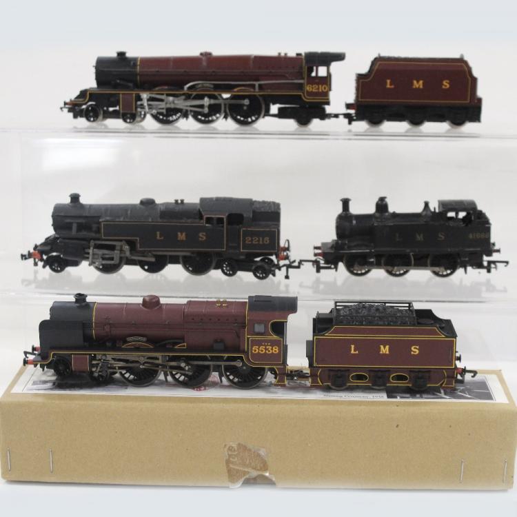 Lot 630 of 959: A Hornby OO gauge Giggleswick locomotive and tender in original box, an LMS Lady Patricia locomotive and tender 6210, an LMS black livery locomotive 41666 and an LMS locomotive 2215 also in black livery (4).