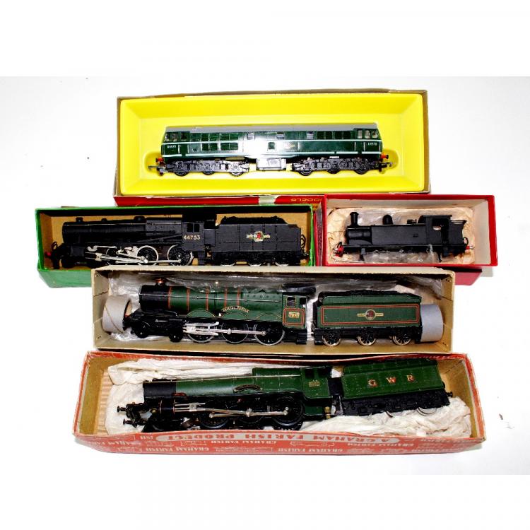 Lot 634 of 959: Three Hornby Dublo engines and tender, a 'GWR 6000 King George V', a 'BR 44753', a 'BR 7013 Bristol Castle', a Hornby Dublo 'R357 BR A-I-A Diesel Electric Locomotive' and a boxed Wills Fine Cast OO 'LMS (Ex Caledonian) 0-6-0 Tank' (5).
