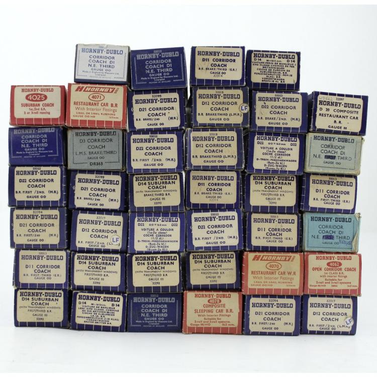 Lot 635 of 959: Over thirty boxed Hornby Dublo coaches to include 'D11 Corridor Coaches', 'D21 Corridor Coaches', 'D12 Corridor Coaches', D14 Suburban Coaches', 'D22 Corridor Coaches', 'D20 Composite Restaurant Car Coaches', '40628 Open Corridor Coach First Class B.R.' with interior fittings, '4078 Composite Sleeping Car B.R.' with interior fittings and other corridor coaches, restaurant cars etc.