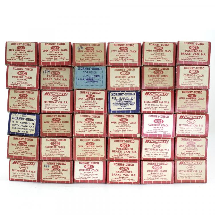 Lot 636 of 959: Over thirty boxed Hornby Dublo coaches to include '4071 Restaurant Cars', '4063 Open Corridor Coaches', '4070 Restaurant Car W.R', '4062 Open Corridor Coaches', '4061 Open Corridor Coaches', '4055 Corridor Coaches', '4060 Open Corridor Coaches', '4075 Passenger Brake Vans B.R.' and '4071 Restaurant Car B.R'.