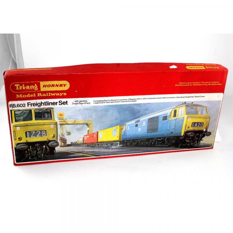 Lot 644 of 959: A boxed Triang/Hornby RS602 Freightliner set containing electric diesel locomotive, two wagons with 3-30ft containers and four 20ft containers, operating Freightliner Depot crane, a large oval of track, power clip and uncoupler.