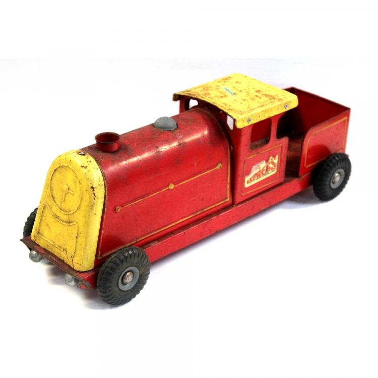Lot 646 of 959: A Tri-ang Express red and yellow tin children's train, length approx 48cm.