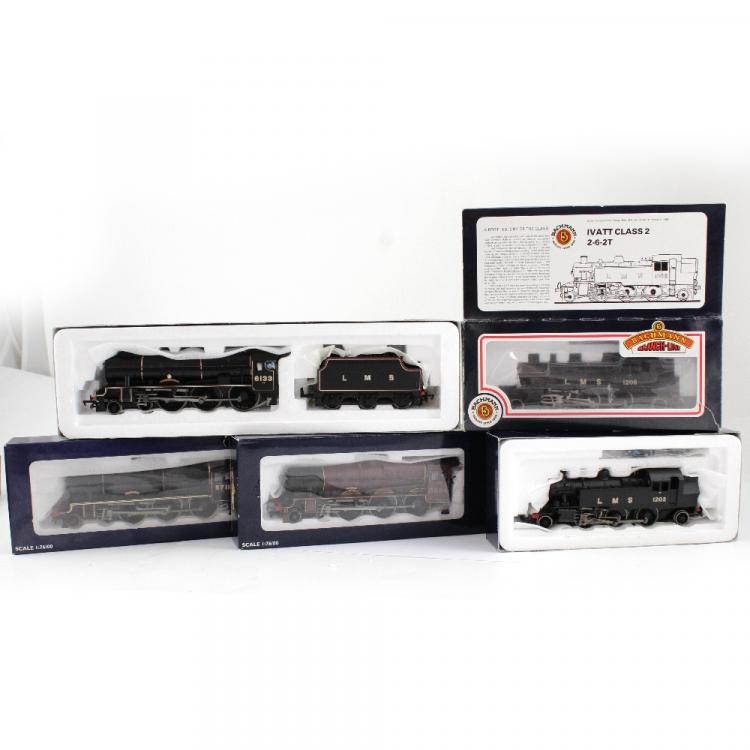 Lot 654 of 959: A collection of Bachmann engines and engines and tenders to include Jubilee 5684 'Jutland' LMS Crimson 4000-Gallon Tender, a rebuilt Scot 6133 'Green Howards' LMS Lined Black, an LMS Ivatt Tank 1202, an Ivatt 2-6-2 Tank, 1206 LMS Unlined Black and a Jubilee 5711 'Courageous' LMS Lined Black 3500-Gallon Fowler Tender, all in original boxes (4).