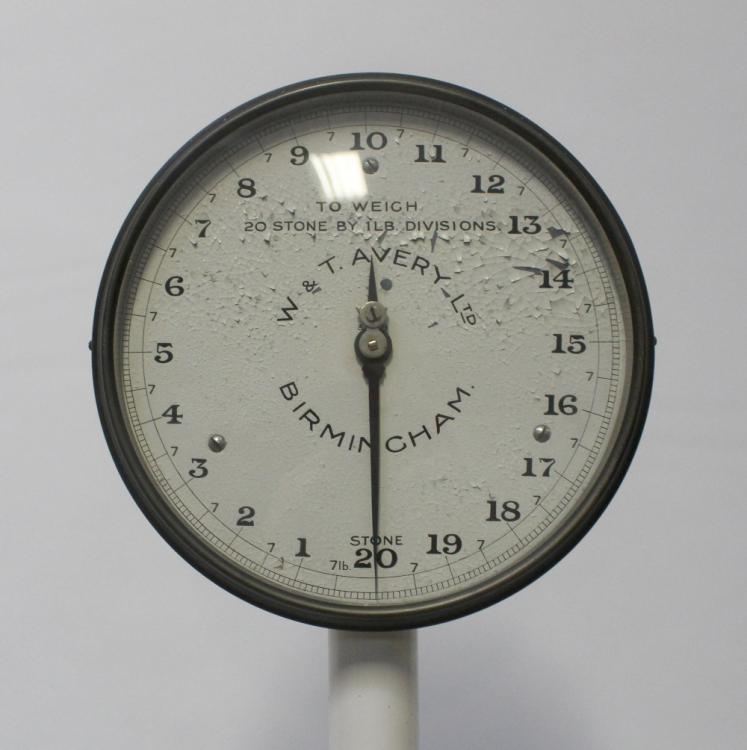 Lot 31 of 590: A set of 1930s Avery bathroom scales with white cased metal foot plate and pole mounted white dial weighing up to 20 stone, marked 'W & T Avery Ltd, Birmingham', height 170cm.