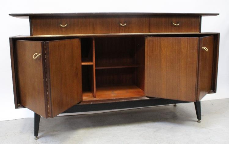 Lot 56 of 590: A late 1950s G-Plan teak sideboard with elevated upper section over three frieze drawers surmounting a four-cupboard base on black frame support to tapering legs, width 149.5cm.