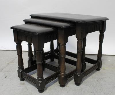 Lot 73 of 590: A small floor-standing oak open bookcase of four shelves and a dark stained mid-20th century nest of three coffee tables, width of largest 65.5cm (2).