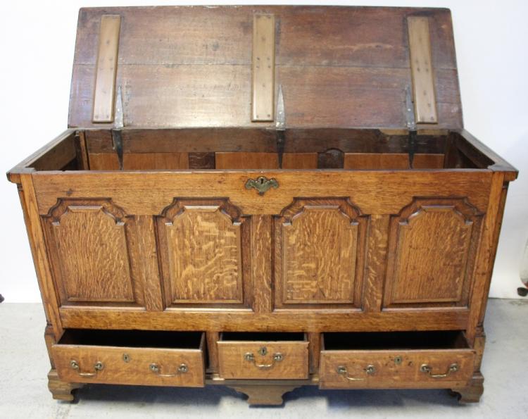 Lot 6 of 1176: An 18th century three drawer mule chest with arched panels to the front and plain pilaster columns, supported on ogee bracket feet, width 155cm.