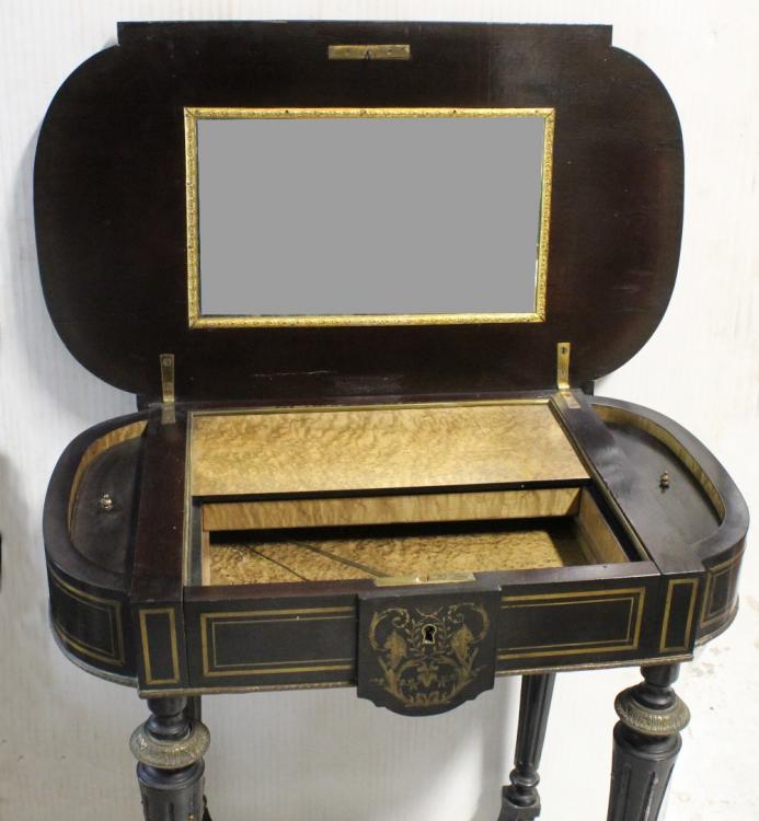 Lot 25 of 1176: A 19th century ebonised ladies' parlour table with brass marquetry and line underlay, width 68cm.