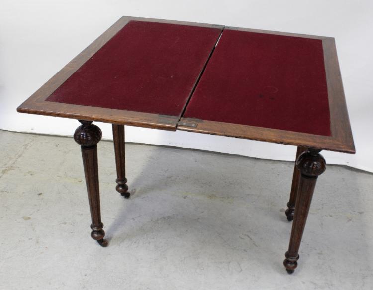 Lot 30 of 1176: A 19th century oak Gothic-style foldover games table, carved frieze with central carved lion head to reeded tapering supports to castors, length when extended 88cm.