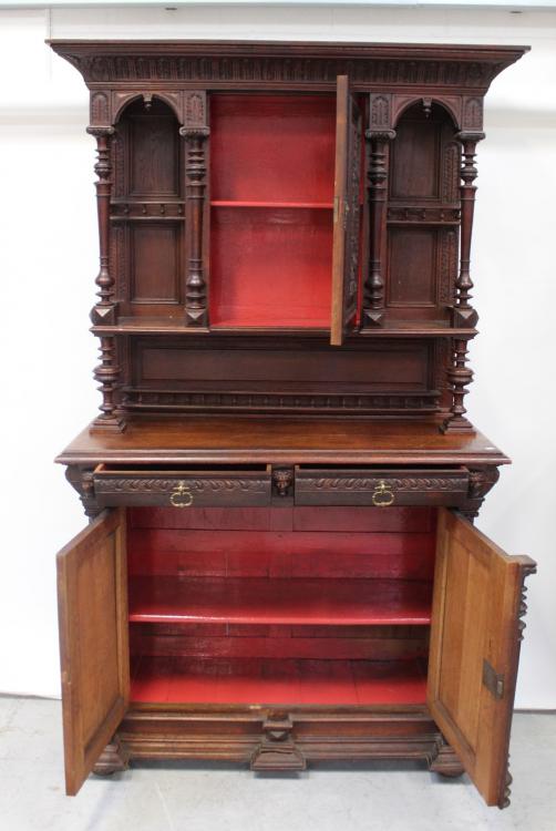 Lot 51 of 1176: A late 19th century French oak dresser, elevated upper section with flared cornice and relief carved door, decorated with vases, dolphins and scrolling acanthus leaves, supported on two drawer two door base over turned feet, height 221cm.