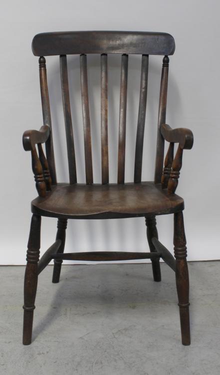 Lot 52 of 1176: A late 19th century stick-back country chair with bobbin-turned supports, height 106cm and a later stick-back armchair on turned legs united by an H-stretcher (2).
