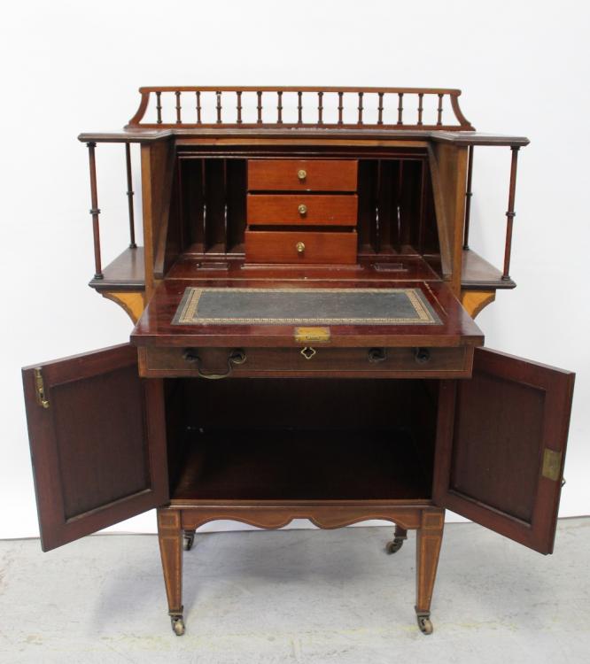 Lot 61 of 1176: An Edward VII mahogany bureau with bobbin turned galleried back and shell paterae inlaid fall front, flanked by shelves, supported on two cupboard base on tapering legs to spayed feet, approx height 107.5cm.
