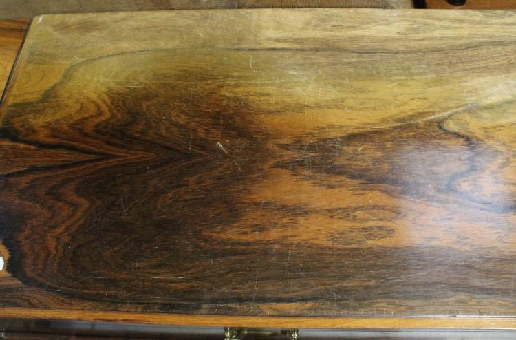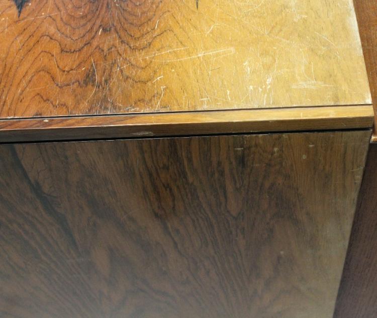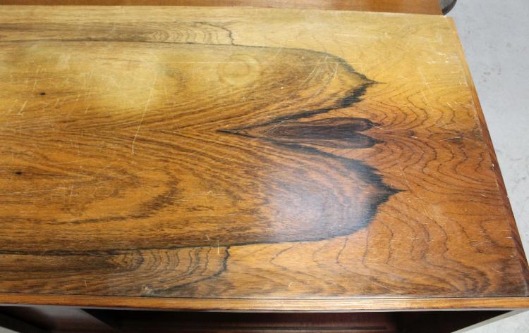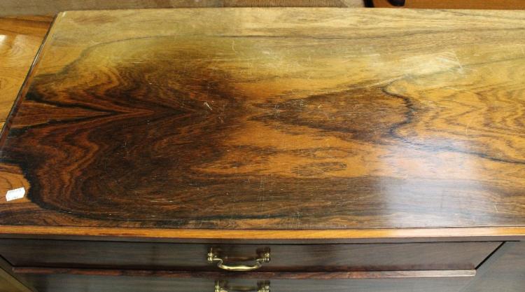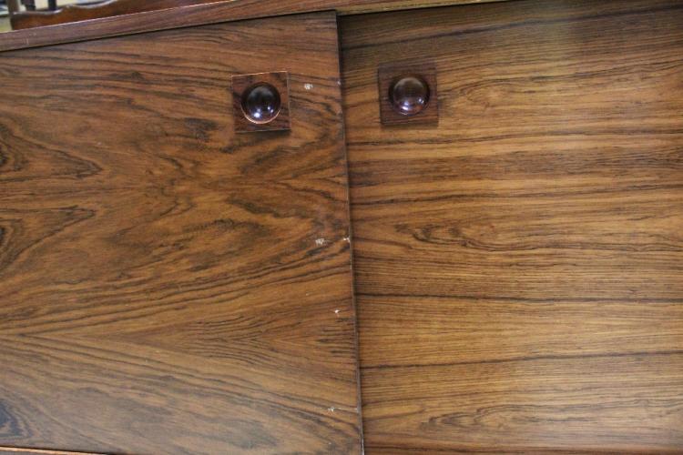 Lot 4 of 788: A mid-20th century rosewood veneer sideboard, four long drawers and two sliding doors to tapering splayed supports, 76 x 213cm. CITES certificate number 577873/02
