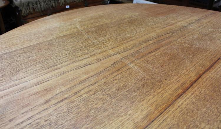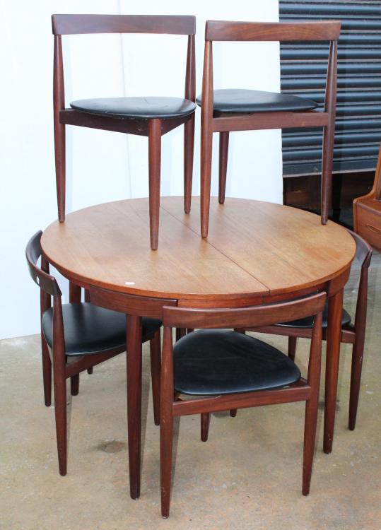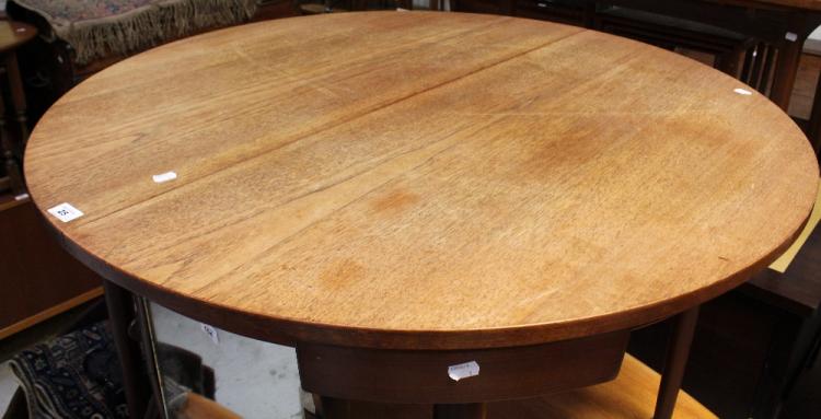 Lot 25 of 788: A c1960s Danish Hans Olsen for Frem Røjle 'Roundette' teak extending dining table with six matching teak chairs, diameter 105cm (7).