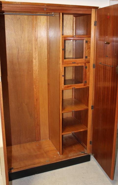 Lot 34 of 788: A c1950s Woolf two-door compactum wardrobe with 'Pyjamas', 'Shirts', 'Underwear' and 'Sundries' compartments as well as provision on the inside of the door for studs and ties, height 185cm.