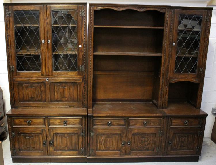 Lot 37 of 788: A late 20th century oak lounge unit in three parts, one with bookcase and drinks cabinet elevated top, one with open bookcase and elevated top and one with leaded glass single door and open compartment top, all on linen-fold panelled door base, two 195 x 95cm, one 195 x 52cm (3).