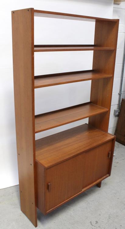 Lot 40 of 788: A late 20th century teak floor-standing bookcase with four open shelves surmounting a twin sliding door cupboard base, height 175cm.