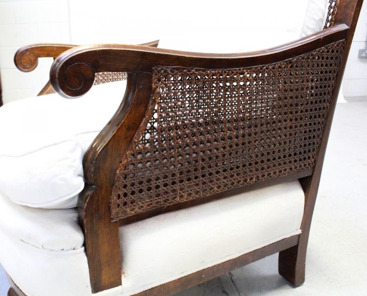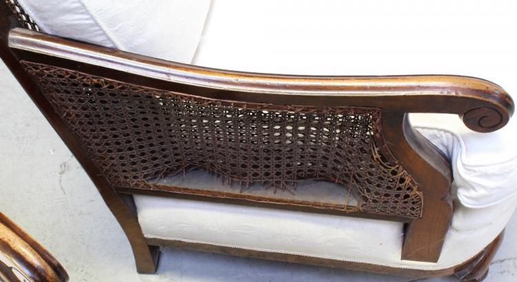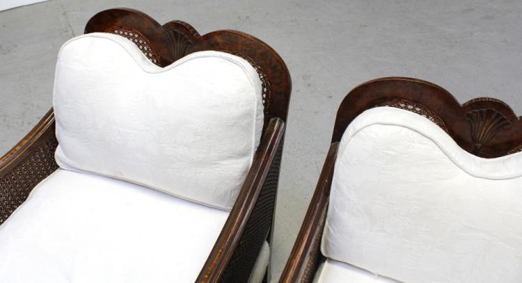 Lot 53 of 788: A 1930s walnut bergère suite comprising two bergère armchairs with white down-filled cushions and matching three-seater sofa, width 165 (canework af) (3).