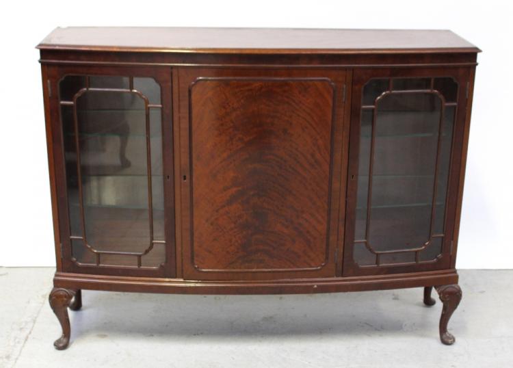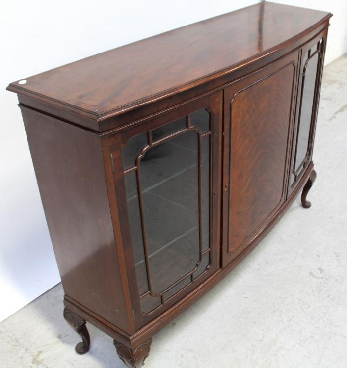 Lot 72 of 788: An early-to-mid 20th century mahogany bow-front display cabinet with single panel door flanked on either side by glazed door enclosing glass shelves, all supported on carved cabriole legs, width 137cm.