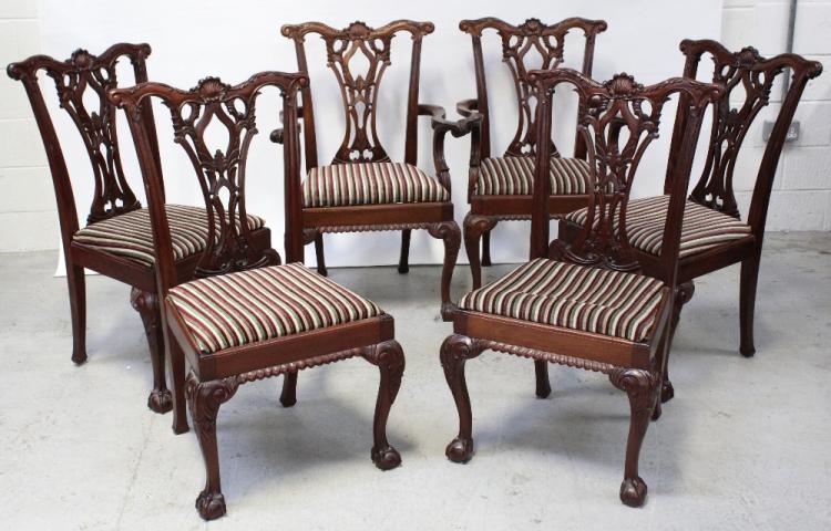 Lot 83 of 788: A set of six 20th century Chippendale reproduction dining chairs with shell-carved Cupid's bow top rail over a pierced and carved splat, above a drop-in seat on acanthus-carved cabriole legs to ball and claw feet (4+2).