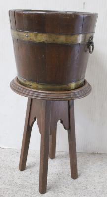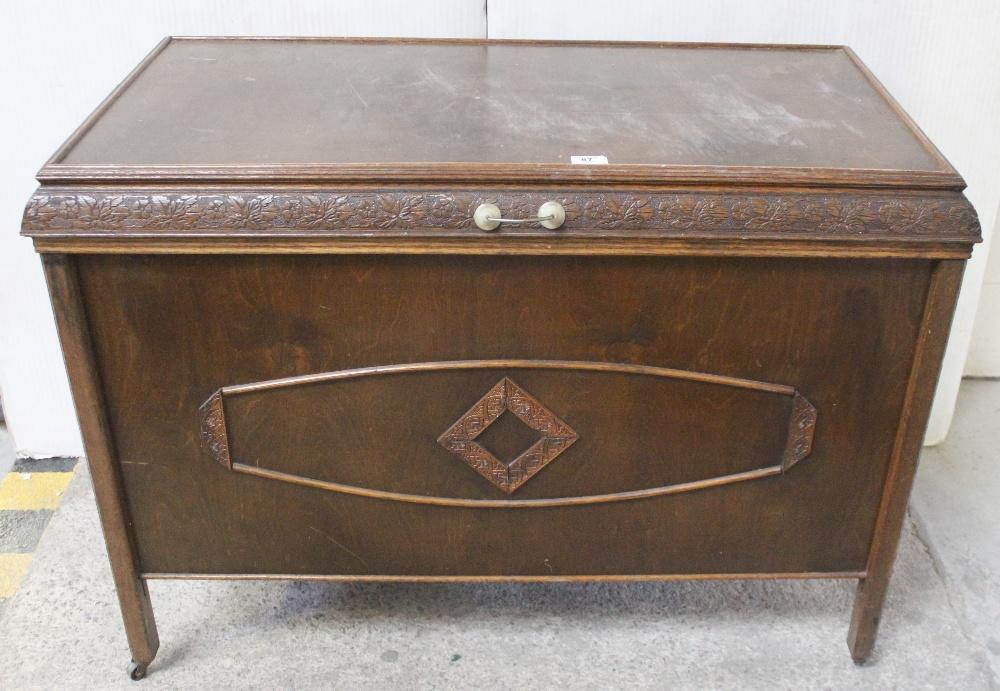 Lot 87 of 796: A c1930s oak blanket box with foliate and floral carved trim, 78 x 94cm, an early 20th century mahogany jardinière stand of small proportions, circular top to outswept supports and a wooden planter with brass banding (3).