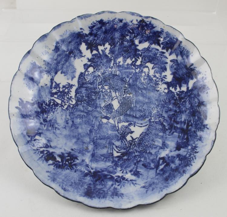 Lot 442 of 796: Eight various colour and black and white engravings, all framed and glazed and a late 19th/early 20th century Japanese blue and white scallop edged charger, diameter 31cm (9).