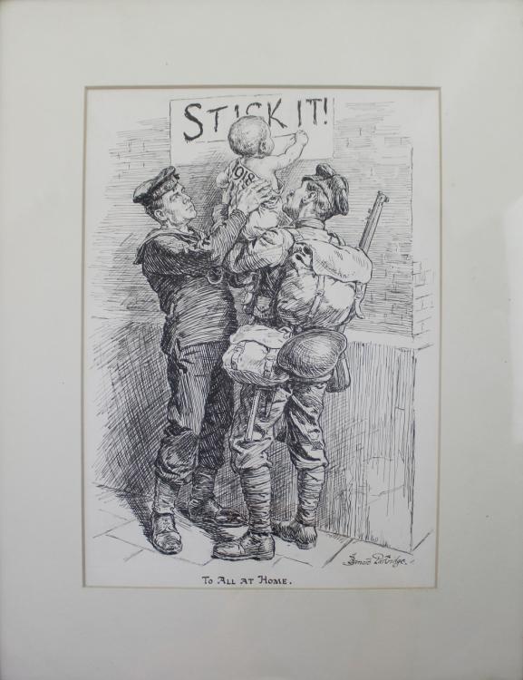 Lot 459 of 796: SIR JOHN BERNARD PARTRIDGE (1861-1945); pen and ink, 'To All At Home', a satirical WWI sketch featuring soldier, sailor and child, signed and bearing blind stamp lower right, approx 33.5 x 25cm, framed and glazed.
