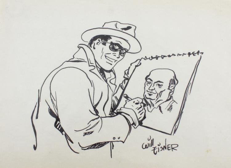 Lot 460 of 796: WILL EISNER; an original signed sketch of 'The Spirit', one of his most well-known creations, this sketch with authentication of his signature, 31.5 x 21cm, unframed.