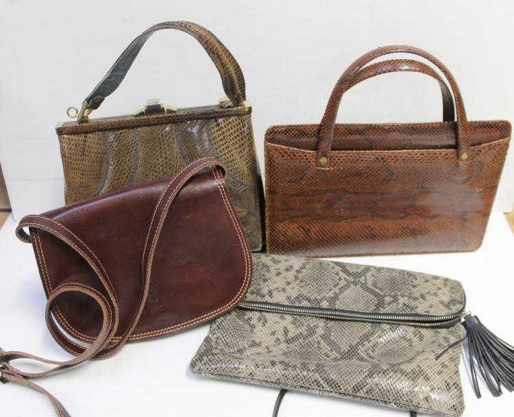 Lot 467 of 796: Two vintage c1960s ladies' handbags to include a faux snakeskin example, an Italian oxblood leather saddle bag and a Jones the Bootmaker faux snakeskin shoulder bag (4).