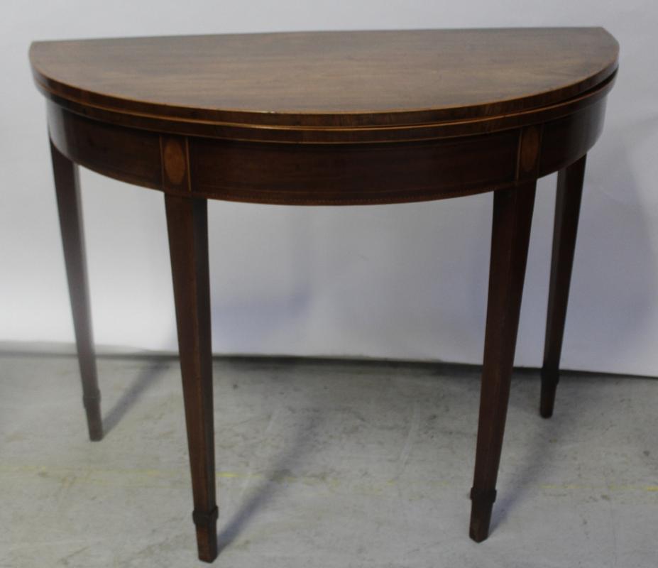 Lot 103 of 787: A 19th century inlaid mahogany demi-lune fold-over tea table, raised on spade feet, length 91cm.