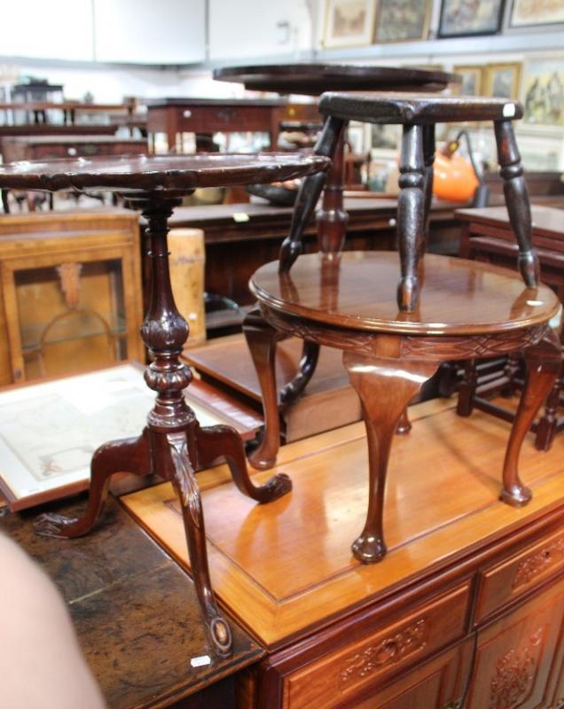 Lot 108 of 787: An 18th century elm-seated stool raised on outswept supports, height 31cm, an early 20th century tripod wine table with piecrust top, height 62cm and and early/mid-20th century mahogany coffee table, diameter 53cm (3).