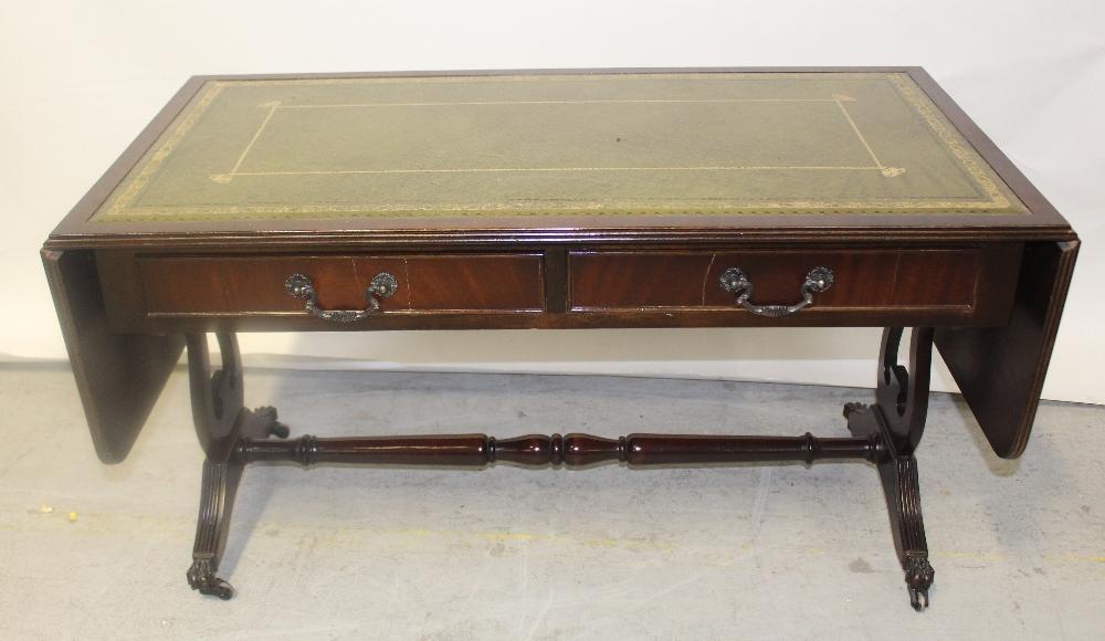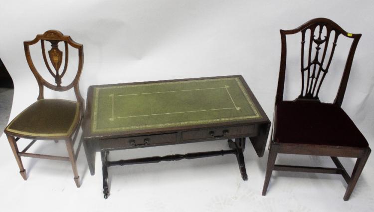 Lot 111 of 787: A reproduction mahogany veneered dropleaf coffee table with green leather inset panels, length unextended 96cm and a Chippendale-style single chair and an Edwardian bedroom chair (3).