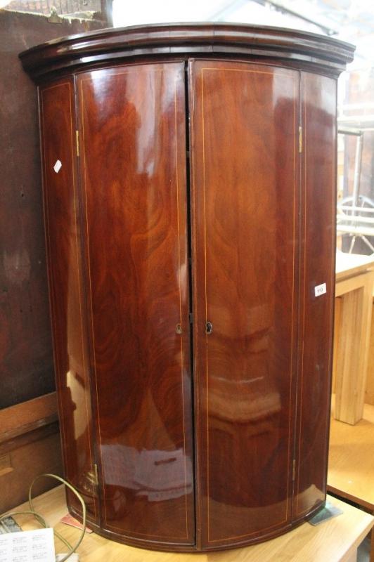 Lot 113 of 787: A Victorian inlaid mahogany bow-front hanging corner cupboard, height 107cm.