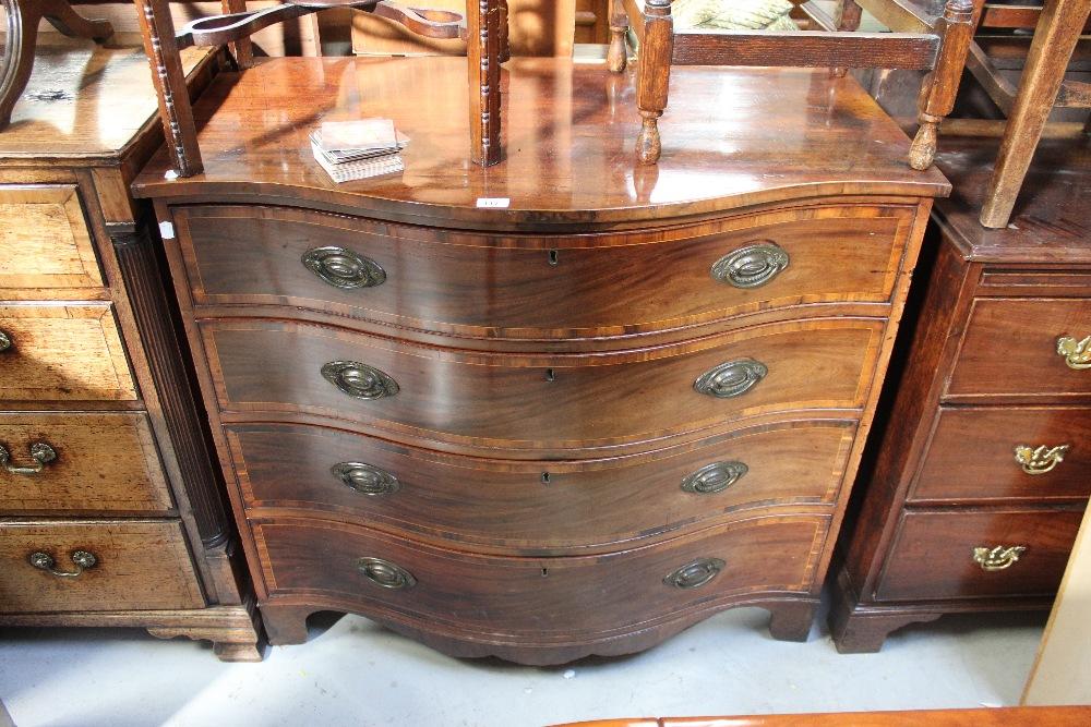 Lot 117 of 787: A 19th century crossbanded mahogany serpentine-fronted chest of four drawers, raised on bracket supports, length 107cm.