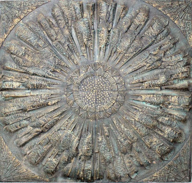 Lot 123 of 787: A 20th century carved wooden architectural wall plaque depicting a four-sectional stylised sunburst within corner motifs, 101 x 100cm.