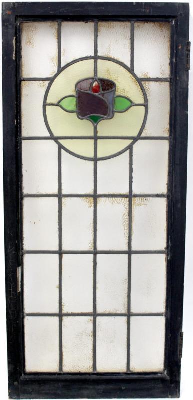 Lot 126 of 787: A leaded and glazed window with rose motif, in painted wooden frame, 111 x 49cm.