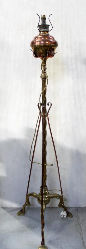 Lot 132 of 787: A Victorian brass and copper telescopic standard oil lamp, later converted to electric, the central twist column mounted with scrolling strapwork and three curved legs ending in paw feet height when extended 230cm.