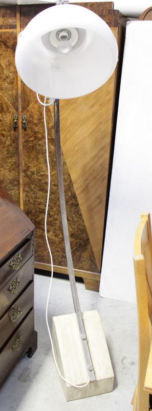 Lot 133 of 787: A vintage Italian-style chrome adjustable arc floor lamp, the white plastic circular shade with single bulb fitment, three adjustable settings, height when extended 260cm.