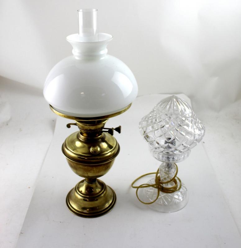 Lot 138 of 787: A cut glass mushroom lamp and a brass oil lamp with milk glass shade, height 51cm (2).